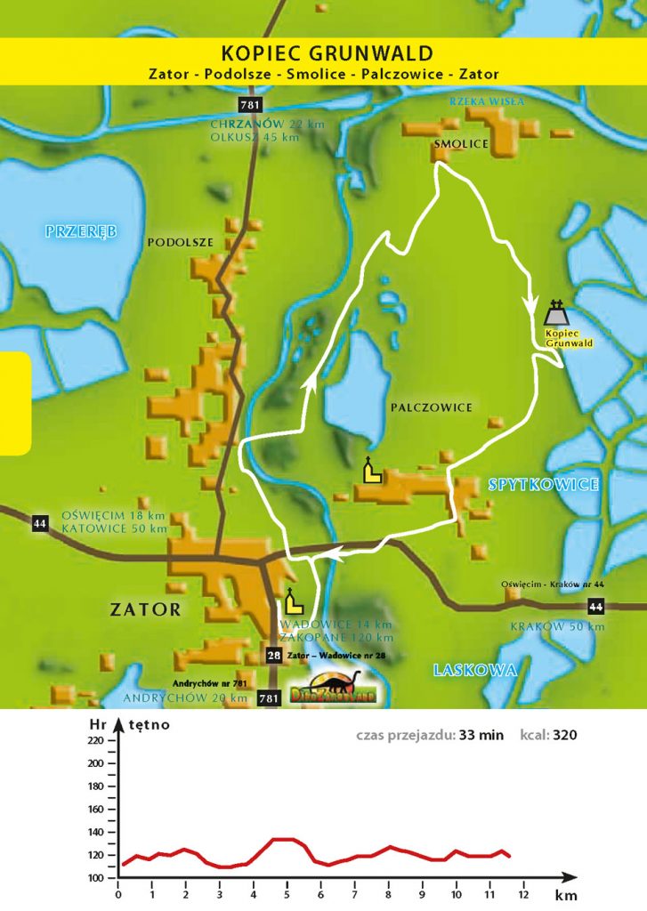 Kopiec Grunwald – trasa atrakcyjna widokowo i urozmaicona topograficznie – od terenów rolniczych poprzez most na rzece Skawie, powyrobiskowe zbiorniki wodne, wieś Smolice docieramy do historycznego miejsca tj. Kopca Grunwaldzkiego w Rabusiowicach (usypany przez mieszkańców w 500 rocznicę zwycięstwa pod Grunwaldem). Kopiec zlokalizowany jest w miejscu dziewiczym przyrodniczo w sąsiedztwie dużego kompleksu stawów rybackich. Jadąc dalej zwiedzamy dziewiętnastowieczny drewniany kościółek w Palczowicach i wracamy do miejsca startu.