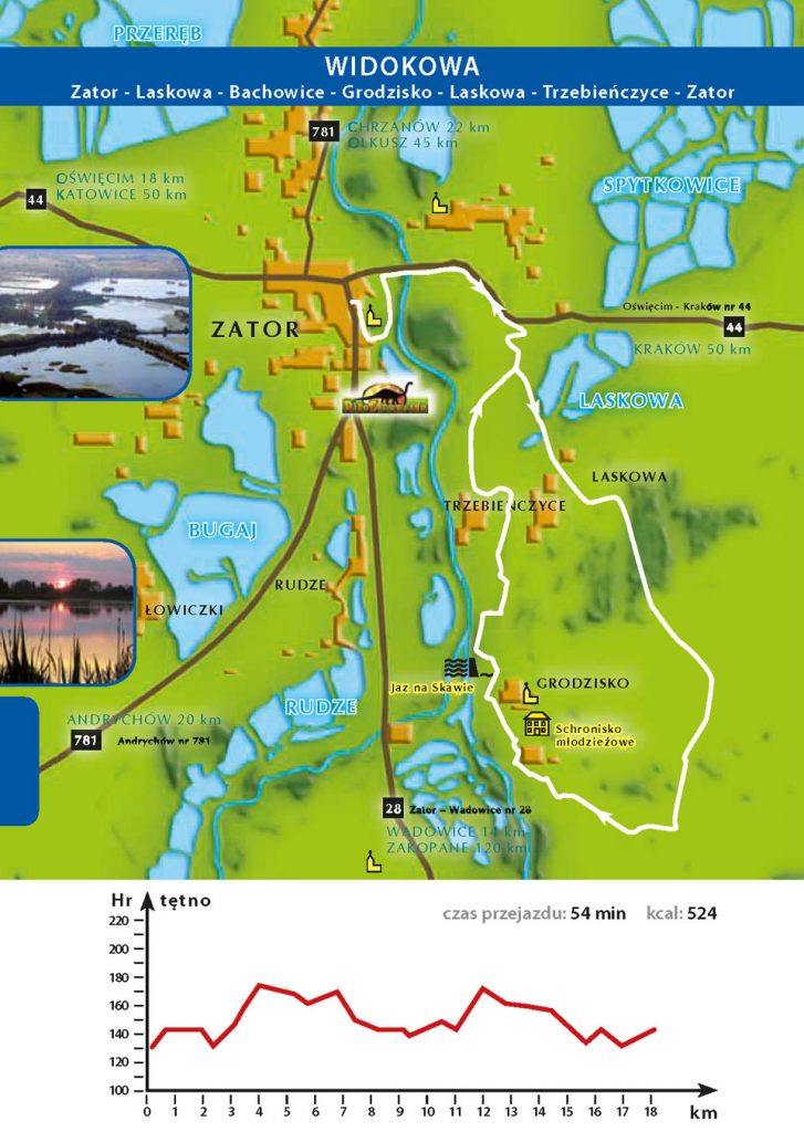 Trasa Widokowa – to wymagająca i zarazem wyjątkowa trasa, na której zobaczysz przede wszystkim panoramę Gminy Zator z kompleksami stawów rybnych w Laskowej (ok. 100 stawów), a także wąwozy lessowe w Laskowej oraz Schronisko Młodzieżowe i Jaz na rzece Skawie. Trasa biegnie przez miejscowości Laskowa, Grodzisko i Trzebieńczyce po wschodniej części Gminy Zator przez piękną okolicę o dużych walorach krajoznawczych.
